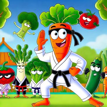 Welcome to Veggie Valley, where Carrote, a young and heroic carrot, leads his veggie friends in action-packed adventures! Trained in karate by the wise Brocco Lee, Carrote, along with agile Lettuce Leaf, fiery Tommy Tomato, clever Pepper Jack, and stealthy Zucchini Ninja, protect their garden home from the mischievous Rotten Bunch. Join